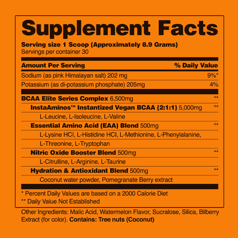 Thành phần: Natri, Kali, Phức hợp BCAA Elite Series, BCAA thuần chay hòa tan nhanh, Hỗn hợp axit amin thiết yếu, Hỗn hợp tăng cường Nitric Oxide, Hỗn hợp hydrat hóa & chống oxy hóa
