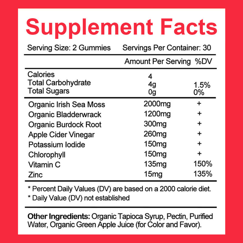 Bạch kim biển Ailen hữu cơ, Vitamin C, kẽm, Bladderwrack hữu cơ, gốc Burdock hữu cơ, giấm táo, kali iodide, chlorophyll