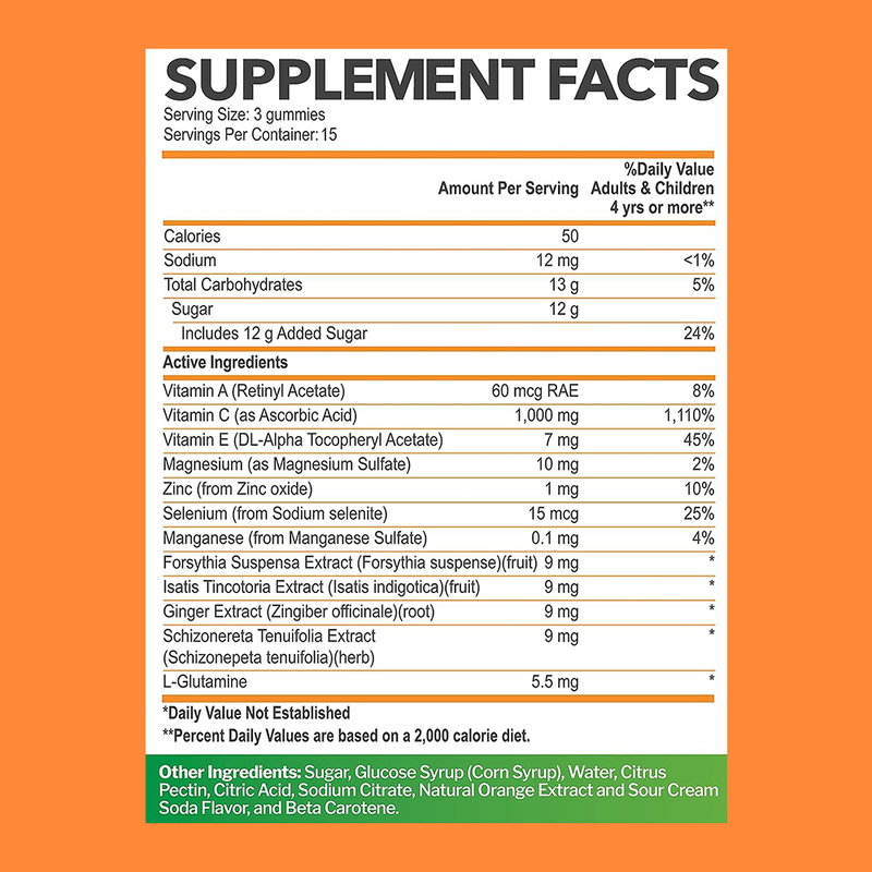 Vitamin C, vitamin A, vitamin E, kẽm, magiê, selen, mangan, chiết xuất gừng, chiết xuất Forsythia Suspensa, chiết xuất Isatis Tincotoria, chiết xuất Schizonereta Tenuifolia, L-glutamine