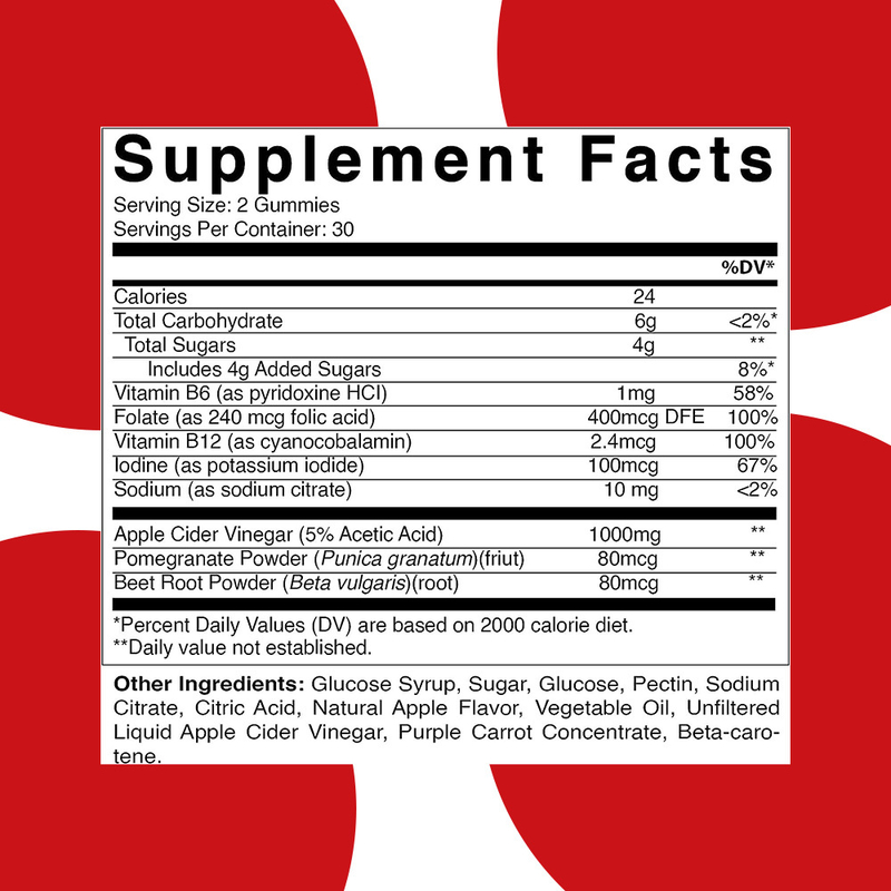 Giấm táo, vitamin B6, folate, vitamin B12, iốt, natri, bột lựu, bột gốc củ cải
