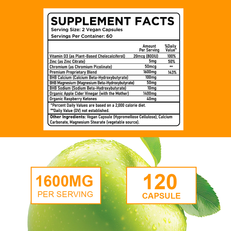 Giấm táo hữu cơ, vitamin D3, kẽm, crôm, hỗn hợp độc quyền cao cấp, BHB canxi, BHB magiê, BHB natri, ketone dâu tây hữu cơ
