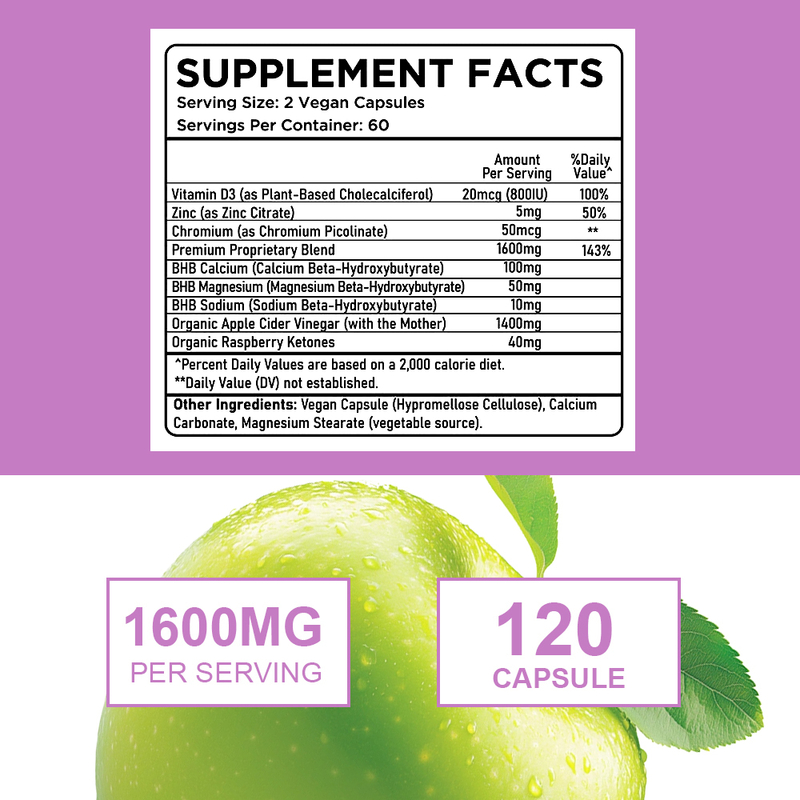 Giấm táo hữu cơ, Vitamin D3, Kẽm, Crom, Hỗn hợp độc quyền cao cấp, BHB Canxi, BHB Magie, BHB Natri, Xeton quả mâm xôi hữu cơ