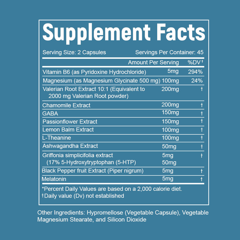 Vitamin B6, Magiê, Chiết xuất rễ cây nữ lang, Chiết xuất hoa cúc, GABA, Chiết xuất hoa lạc tiên, Chiết xuất chanh, L-Theanine, Chiết xuất Ashwagandha, Chiết xuất Griffonia Simplicifolia, Chiết xuất quả hồ tiêu đen, Melatonin