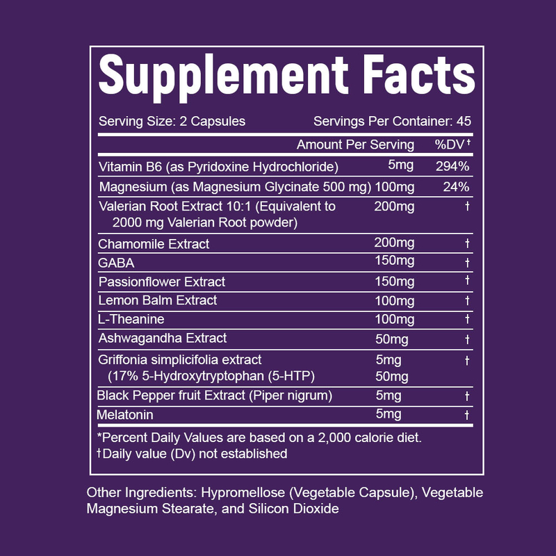 Vitamin B6, Magie, Chiết xuất rễ cây nữ lang, Chiết xuất hoa cúc, GABA, Chiết xuất hoa lạc tiên, Chiết xuất chanh, L-Theanine, Chiết xuất Ashwagandha, Chiết xuất Griffonia Simplicifolia, Chiết xuất quả hồ tiêu đen, Melatonin