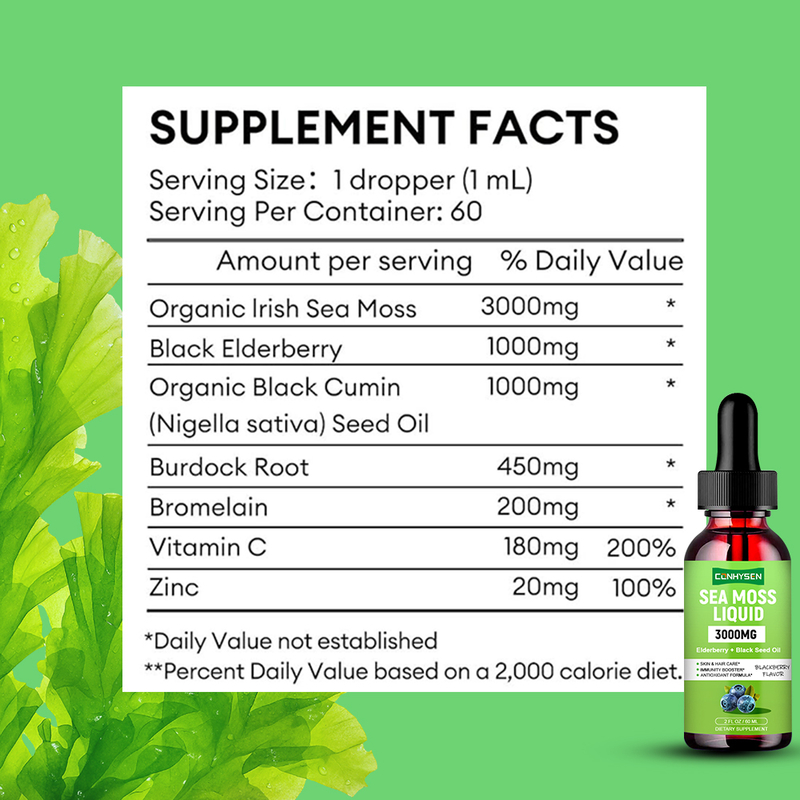 Tảo biển Irish hữu cơ, Vitamin C, Cơm cháy đen, Rễ ngưu bàng, Hắc mai biển hữu cơ, Bromelain, Kẽm