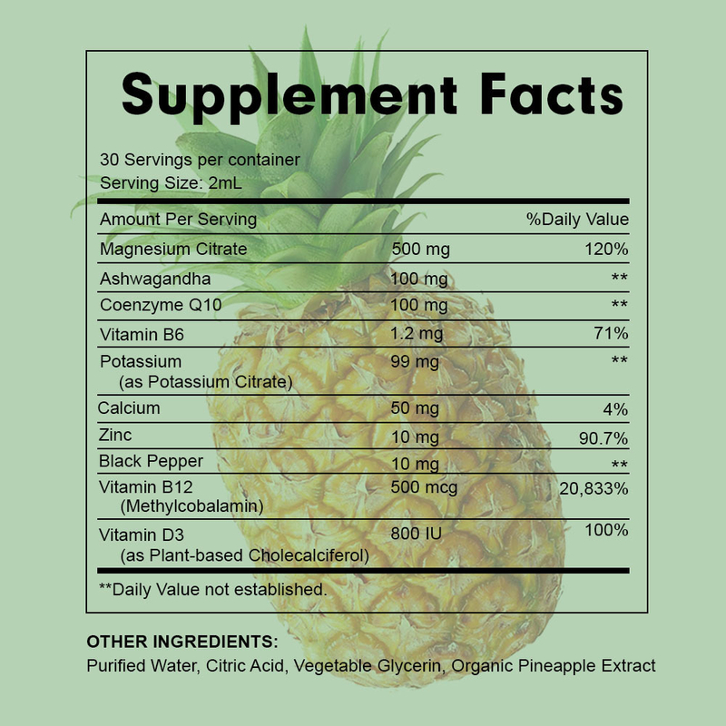 Magie Citrate, Ashwagandha, Coenzyme Q10, Vitamin B6, Kali, Canxi, Kẽm, Tiêu đen, Vitamin B12, Vitamin D3